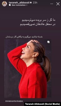 ترانه علیدوستی، یکی از هنرمندانی که علیه او شکایت شده بود، پست شبنم فرشادجو را در بخش استوری اینستاگرم خود به اشتراک گذاشت و نوشت:
