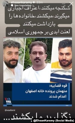 احسان کرمی در استوری اینستاگرام گفت: «شکنجه میکنند، اعتراف اجباری میگیرند، میکشند، خانوادهها را بازداشت میکنند، لعنت ابدی بر جمهوری اسلامی.»