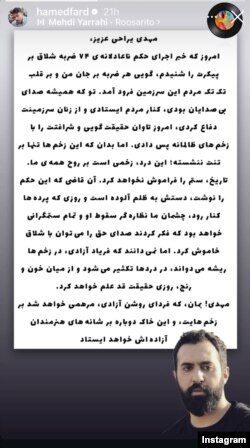 او همراه با این ویدئو نوشت: «مهدی یراحی، برادر همسنگرمان را که سال‌ها با صدای اذانش افطار می‌کردید را در ماه رمضان شلاق زدید؟ نماز و و روزه‌هاتون بخوره توی سرتون، چی به سر هنرمدان و مردمان شریف این مرز ‌ بودن دارید می‌آرید؟ لعنت به شماها.»