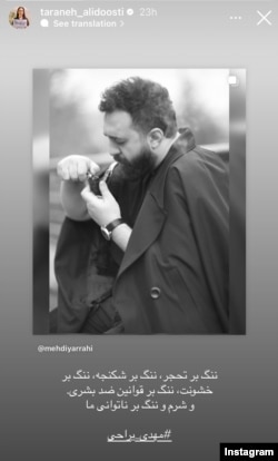 ترانه علیدوستی، بازیگر، با انتشار استوری در اینستاگرام، نوشت: «ننگ بر تحجر، ننگ بر شکنجه، ننگ بر خشونت، ننگ بر قوانین ضد بشری، و شرم و ننگ بر ناتوانی ما.»