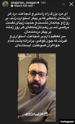 مژگان شجریان، خواننده، با انتشار استوری در اینستاگرام، فیلمی از مهدی یراحی را به اشتراک گذاشت و نوشت: «ای مرد بزرگ راه راستی و شجاعت، درد هر تازیانه‌ ناحقی که بر پیکر استوارت زدند، بر روح و جانمان نشست و حدیث زیبای نفست، مرهمی شد بر زخم تازیانه‌های هر روز زمانه بر پیکر دردمندمان.»