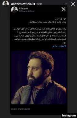 علی عظیمی، خواننده، با انتشار استوری در اینستاگرام، تصویری از مهدی یراحی را به اشتراک گذاشت و نوشت: «مهدی عزیز، تو در دل و ذهن یک ملت مثال استقامتی، یک موی تو فدای همه مردان صحنه‌ای که از حق خواندن زنان کشورمان دفاع نکردند، و با رژیم تا بن فاسد جمهوری اسلامی همدست شدند تا اجراهای مبتذل‌شان روی صحنه برند.»