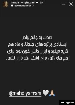 هنگامه قاضیانی، بازیگر، در استوری اینستاگرام، نوشت: «دردت به جانم برادر، ایستادی بر تپه‌های جلجتا، و ماه هم گریه می‌کرد و ایران دلش خون بود برای زخم‌های تو، برای اشکی که باران نشد.»