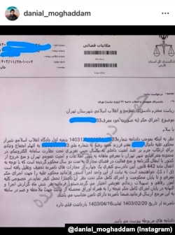 بر اساس تصویر حکمی که این رپخوان جوان در اینستاگرام منتشر کرده، دادسرای فارس اجرای این حکم را به دادسرای عمومی و انقلاب شعبه ۲۲ تهران واگذار کرده است و دانیال مقدم دوره محکومیت خود را زیر نظر این نهاد قضایی سپری خواهد کرد.