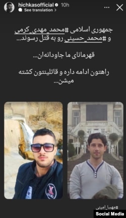 سروش لشکری مشهور به «هیچکس» رپخوان ایرانی در واکنش به اعدام دو معترض ایرانی دیگر در استوری حساب کاربری خود در اینستاگرم نوشت «جمهوری اسلامی محمد مهدی کرمی و محمد حسینی رو به قتل رسوند.» او در ادامه افزود «قهرمانای ما جاودانهان…راهتون ادامه داره و قاتلینتون کشته میشن...»