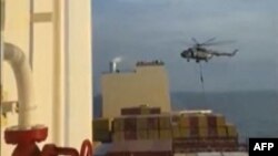ویدئویی که توسط آسوشیتدپرس مشاهده شده است، نشان میدهد که کماندوها با هلیکوپتر به یک کشتی در نزدیکی تنگه هرمز حمله میکنند.