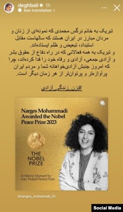 نازنین بنیادی، بازیگر، و فعال حقوق بشر، در حساب کاربری خود در اینستاگرام، ضمن تبریک به نرگس محمدی نوشت: «او یک مدافع سرسخت و پیگیر حقوق بشر در ایران است که به دلیل فعالیتهای شجاعانه خود در حال حاضر زندانی است.»