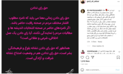 یک مقام حقوقی در دولت روحانی با انتشار مطلبی در حساب اینستاگرامش «حق رای ندادن» را در وضعیت «امتناع» «نشانه شرافت و آزادگی» دانسته است.