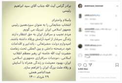 عبدالناصر همتی در پیامی در اینستاگرام خود، به ابراهیم رئيسی به عنوان رئیس جمهوری منتخب تبریک گفت. او ابراز امیدواری کرد که رئيسی «با تدابیر و اقدامات خود» تحت «زعمات حضرت آیت الله خامنهای»، موجب سرافرازی جمهوری اسلامی و رفاه ملت ایران شود.