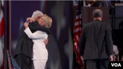 بیل کلینتون بعد از سخنرانی همسرش او را در آغوش گرفت.