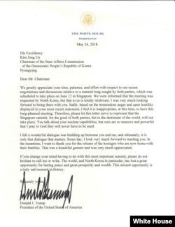 رسانه های آمریکا پنجشنبه صبح به وقت واشنگتن نامه ای از پرزیدنت ترامپ خطاب به کیم جونگ اون رهبر کره شمالی منتشر کردند که در آن رئیس جمهور آمریکا، نوشته دیدار برنامهریزیشده با رهبر کره شمالی را به دلیل خشم فراوان و خصومت آشکار کره شمالی با آمریکا لغو کرده است.