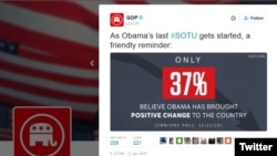 GOP یا Grand Old Party در توئیت قبل از سخنرانی اوباما یک نظرسنجی ماه پیش سیانان را منعکس کرد که می گوید تنها ۳۸ درصد آمریکایی ها معتقدند اوباما تغییرات مثبتی در کشور ایجاد کرده است.