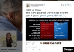 جنیفر فریدمن، از تیم مطبوعاتی رئیس جمهوری آمریکا با انتشار این نمودار مقایسه ای، استدلال کرده، زمانی که اوباما رئیس جمهور آمریکا بوده وضع بهتر شده است. براساس جدول اواشتغال در آمریکا در پایان دوره بوش، هشتصد هزار کاهش داشت اما دولت اوباما در این هفت سال چهارده میلیون شغل ایجاد کرد.