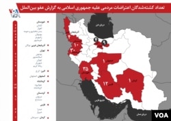 نقشهای از برخی شهرهای بزرگ ایران که در روزهای شنبه ۲۴ و یکشنبه ۲۵ آبان شاهد حضور معترضان به حکومت جمهوری اسلامی ایران بودند. نام برخی شهرهای کوچک در این نقشه نیامده است.